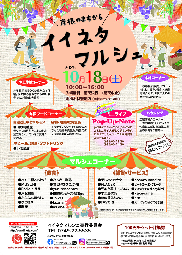 このまちで生きている、わたしたち丸松木材。しごとを通じてもっと彦根のまちに活きてほしい。そして地元の皆様に恩返しをしたい。その願いがさらに膨らみ、地元のイイネタを集めたお祭り、イイネタマルシェを2013年から開催しています。「顔」「産地」「日々」の3つをコンセプトに掲げ、暮らしを楽しくするイイネタを地元の皆さんに楽しんでいただいています。